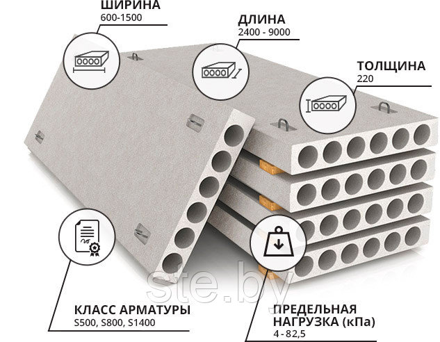 Длина у таких перекрытий варьируется от 2,4 м до 7,2 м, с шагом в 30см, а ширина 1,2 м и 1,5м, высота стандартная для всех плит равная 22см.